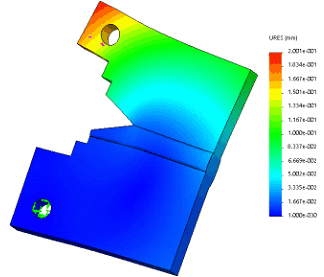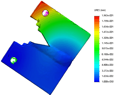 Los desplazamientos que ocurren en la probeta escaneada se muestran en la figura 7. Los desplazamientos mayores ocurren en el extremo libre de la probeta, en la cercanía con el orificio donde se aplica la carga. Esto se corresponde con el ensayo de crecimiento de grieta, pues es la zona que se corresponde con la acción del cabezal móvil. Tienen un valor de 0,196 mm. De ser necesario, se determinan los desplazamientos en los nodos ubicados en las inmediaciones de la punta de la grieta y con los valores obtenidos es posible computar el factor de intensidad de tensiones.
