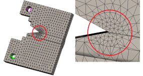 En el caso de la probeta simulada también se utilizó una malla sólida, con elementos cuadráticos de alto orden de un tamaño máximo de 4,0 mm en la parte de malla gruesa y de 1,4 mm para el control de malla utilizado en las cercanías de la grieta respectivamente, figura 4.