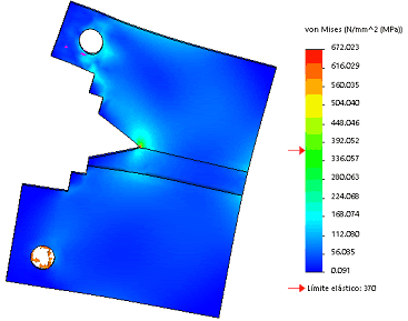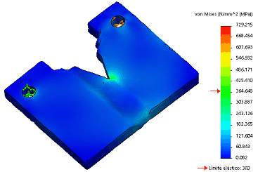 La sujeción de la probeta se realiza en el orificio superior, donde se aplican restricciones fijas; mientras que en el orificio inferior se aplicó una carga de 10 kN.