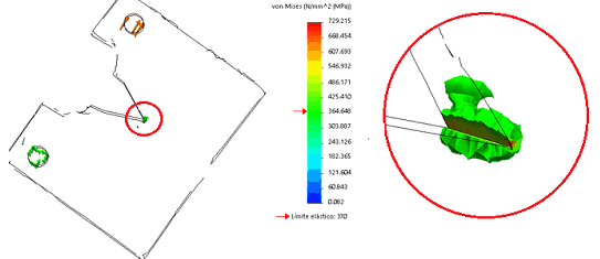 Las tensiones en la punta de la grieta superan 1,97 veces el valor del límite elástico. Esto favorece el crecimiento de la misma. En la figura 9 se expone una isosuperficie de las tensiones cuando alcanzan valores superiores al límite elástico del material. Estas tensiones solo ocurren en una zona muy cercana a la grieta. Esto favorece el crecimiento de la entalla cuando se solicita la pieza por cargas variables. Igual que se expuso para la probeta escaneada, el estado tensional que se produce en la probeta simulada, refleja lo que ocurre en las probetas reales, donde debido a la configuración de la grieta y del elevado gradiente de tensiones que se produce, la grieta aumenta su tamaño en el tiempo cuando se aplican las cargas exteriores cíclicas. También se pretende destacar que es posible circunscribir el volumen ocupado por las tensiones plásticas en un cilindro, como ya se expuso antes para el caso del estado tensional en la probeta escaneada.