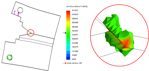 Sin embargo, este estado tensional cambia bruscamente en las inmediaciones de la grieta, figura 6. Las tensiones en la punta de la grieta superan 2,14 veces el valor del límite elástico. Esto favorece el crecimiento de la misma. Como se aprecia en la figura 6, donde se muestra una isosuperficie de las tensiones superiores al límite de fluencia del material, estas tensiones solo ocurren en una zona muy cercana a la grieta. Esto favorece el crecimiento de la misma ante la acción de las cargas variables. De hecho es lo que sucede en las probetas reales, debido a la configuración de la grieta, además del elevado gradiente de tensiones que se produce, la grieta aumenta su tamaño bajo la acción de las cargas exteriores. También se quiere destacar la forma del volumen que ocupan las tensiones plásticas en este modelo. Obsérvese en la imagen derecha de la figura 6, que aunque este volumen no es un cilindro, sin embargo puede circunscribirse dentro de un cuerpo tridimensional con esta configuración. Este resultado está acorde con lo reportado en la bibliografía [15] donde se analiza el campo de tensiones que surgen alrededor de la grieta, y se aproximan estas tensiones a un cilindro para el estudio del Factor de Intensidad de tensiones.