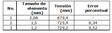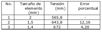 En los resultados mostrados en la tabla 4 es posible apreciar que se logra la convergencia del mallado con el tamaño de elemento finito de 1,4 mm.