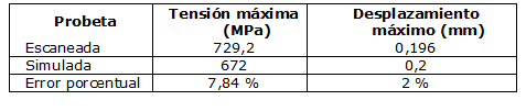 En la tabla 5 están los resultados de la comparación entre las tensiones y los desplazamientos de las probetas escaneada y simulada. Para realizar esta se tomaron los valores máximos de cada uno de estos parámetros y después se determinó el error porcentual entre ellos mediante la ecuación 1. Para el caso de los desplazamientos, se sustituyó en esa ecuación el término tensión por desplazamiento.