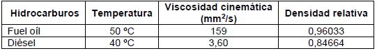 La mezcla de Fuel Oíl-Dieselde viscosidad cinemática de 159 mm2/s y 3,60 mm2/s a 50 ºC y 40 ºC respectivamente da como resultado un hidrocarburo de 109,11 mm2/s a 50 ºC.