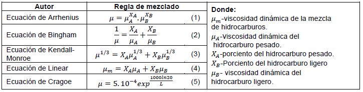 Para obtener la viscosidad cinemática partiendo de las reglas de mezclado, tabla 2, se ha seguido un procedimiento basado en el empleo de correlaciones matemáticas propuesta por varios autores, como a continuación se muestra: