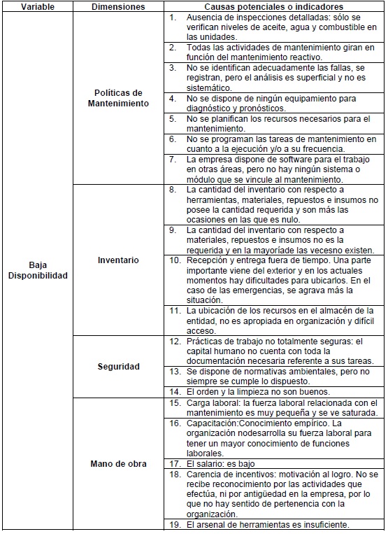 Para tener una mejor visualización de los resultados obtenidos en el diagrama anterior, se procede a confeccionar una tabla que expresa la relación entre la variable de estudio (baja Disponibilidad), con sus dimensiones (4) y éstas con las causas potenciales correspondientes (19), tabla 1.