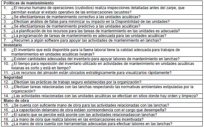 Mediante este instrumento se definieron 4 dimensiones y 19 causas potenciales o indicadores que influyen en la variable baja Disponibilidad en las unidades acuáticas livianas.