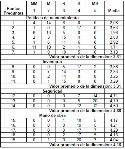 Las preguntas incluidas en este instrumento (entrevista estructurada) fueron validadas mediante un juicio de expertos, para lo cual fueron seleccionados doce profesionales, con conocimiento en el área de mantenimiento, los mismos expresaron que el instrumento cumplía con los lineamientos establecidos en cuanto a materia metodológica y técnica y confirmaron su confiabilidad (validez del grado en que el instrumento mide lo que debería medir) [9].