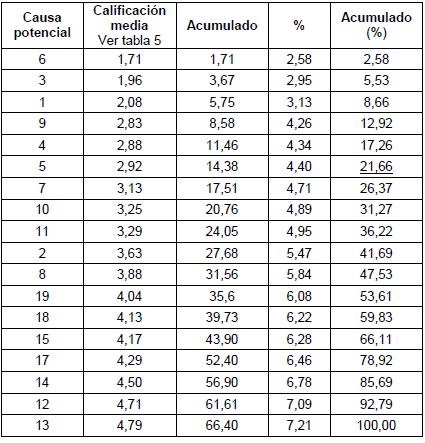 A continuación, se aplica el Método de Pareto, Tabla 6, a las veinte causas potenciales para definir el orden de prioridad y, por tanto, de su atención y las mejoras correspondientes.