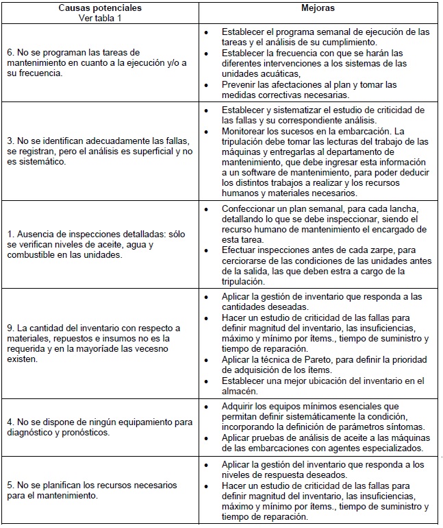 Aplicando la técnica de Pareto, tabla 6, se obtiene que las causas potenciales, clase A, que llevan la mayor prioridad en la atención son en el siguiente orden: 6, 3, 1, 9, 4 y 5. A ellas estarán dirigidas las propuestas de mejoras, tabla 8: