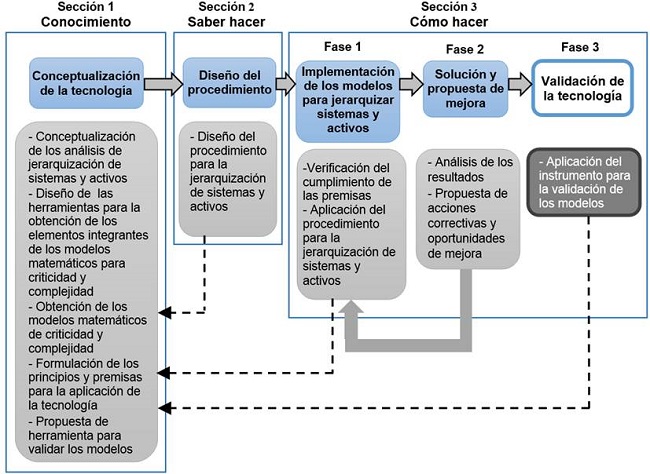 En la investigación se propuso una tecnología para la jerarquización de los sistemas tecnológicos y activos en empresas biofarmacéuticas, sobre la base de una tecnología definida como: “conjunto de conocimiento científicos, empíricos e ingenieriles tangibles e intangibles encaminados al saber hacer y al cómo hacer productos, procesos y servicios, de la producción, la distribución y comercialización” o como un “producto de la ciencia y la ingeniería que envuelve un conjunto de instrumentos, métodos, y técnicas que se encargan de la resolución del conflicto” [15, 16]. La tecnología propuesta contiene un conjunto de conocimientos científicos e ingenieriles que sustentan el saber hacery propone un procedimiento para la aplicación de la misma posibilitando el cómo hacer. En la figura 1 se expone el mapa de la tecnología propuesta con sus elementos integrantes.