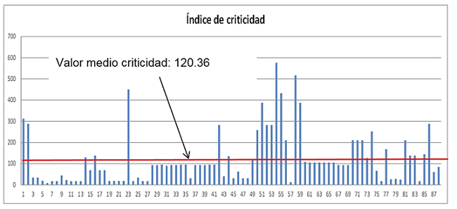 Aplicando los modelos de las ecuaciones 1, 2 y 3 se obtienen los valores de criticidad para cada activo de la planta, estos valores son graficados en las figuras 3 y 4.