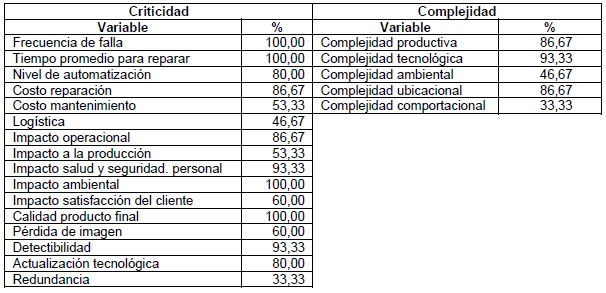 Aplicando la tecnología y el procedimiento propuestos se obtienen los modelos matemáticos de criticidad y complejidad. La obtención de los modelos matemáticos se realizó a través de una encuesta directa a los expertos que participaron en la investigación. Los criterios o variables a analizar, en conjunto para ambos modelos, se obtuvieron como una tormenta de ideas. En base a ello se realizó dicha encuesta donde se les da la posibilidad a los expertos de seleccionar o no la variable que de acuerdo a sus criterios y conocimientos debe formar parte de los mismos.