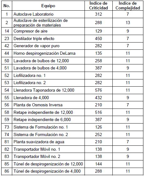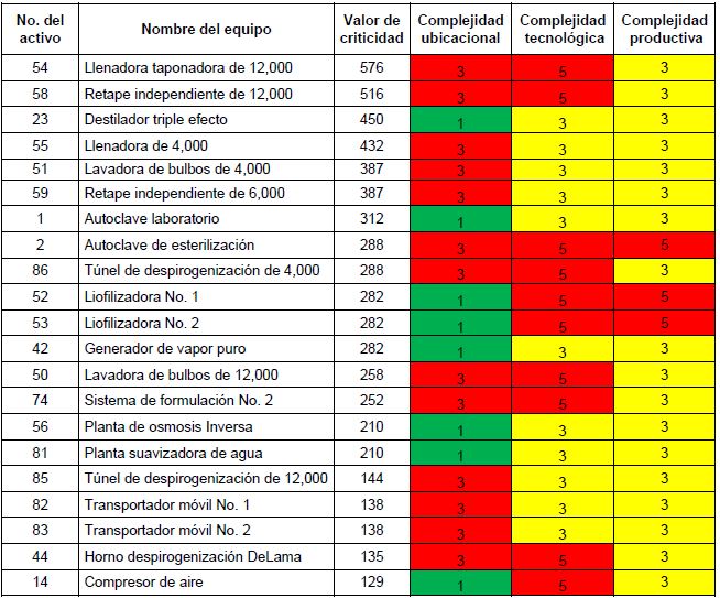 La aplicación de la tecnología propuesta compuesta por los dos modelos matemáticos de criticidad y complejidad para una empresa biofarmacéutica permitió obtener una lista jerarquizada de sus sistemas tecnológicos y activos a través de una matriz que permitió una diferenciación de los recursos financieros, técnicos y humanos para el personal que toma decisiones en la entidad.