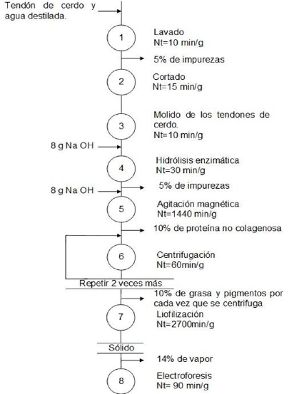 Las operaciones propuestas en el procedimiento de obtención de colágeno son: Lavado de la materia prima; Corte; Centrifugación; Homogeneización; Agitación; Neutralización; Dializado; Liofilización; Pesado; Pruebas de caracterización; Filtración y Disolución en ácido acético [11, 12].