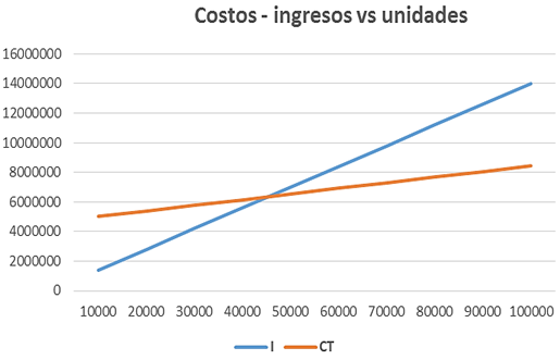 Como se observa en la Fig. 4 el punto de equilibrio de este producto se obtiene cuando el precio es igual a $ 6608008,00; para lo cual deben ser vendidos 45411 andamios. Este gráfico muestra en el punto de equilibrio la función ingreso y la función costo total cuando se igualan, donde se obtendrán ganancia una vez producidos 45411 andamios.