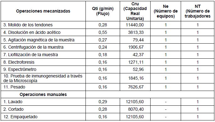 En la tabla 1 se muestra que el proceso de obtención de andamios de colágeno diseñado necesita un equipo por operación y un trabajador por equipo.