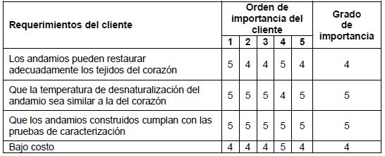 A partir de una tormenta de ideas realizada con los clientes se obtuvo el grado de importancia otorgado a cada una de las características de calidad definida. Estos resultados se incluyen en tablas como ponderaciones.