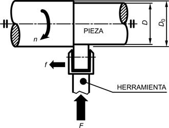 El tratamiento mecánico-térmico reiterado consta de un número de ciclos, A, cada uno de ellos compuesto por una etapa de deformación plástica y un tratamiento, posterior, de envejecimiento. La deformación, para piezas tipo árbol, figura 1, se lleva a cabo mediante una herramienta bruñidora que se presiona, con una fuerza constante, F, contra una pieza que gira a una frecuencia de rotación, n. La herramienta bruñidora avanza, a lo largo del eje de la pieza, con un avance, f, y provoca una deformación plástica que lleva el escalón del diámetro inicial, D0, al diámetro final, D. La velocidad de rodadura, entonces, se puede determinar por la expresión 1: