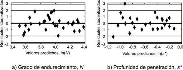 Para el grado de endurecimiento, N, y la profundidad de penetración del endurecimiento, s*, se obtuvieron, respectivamente, los siguientes modelos de regresión potencial, expresiones 5 y 6:
