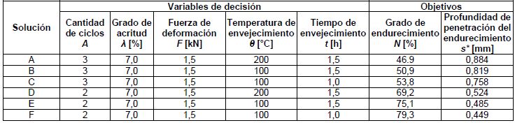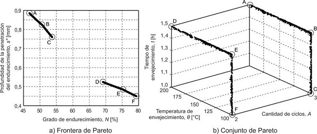 El endurecimiento producido por la combinación de deformación plástica y envejecimiento se concentra en la superficie de los materiales tratados. Estos valores de endurecimiento cambian, siguiendo un determinado patrón desde la superficie hacia el núcleo del material. Consecuentemente, para lograr la efectividad, es preciso aumentar tanto la dureza como la profundidad de penetración de la misma. No obstante, al no ser igual la influencia de las variables tecnológicas del tratamiento mecánico-térmico reiterado sobre dichos parámetros, la optimización de ambos puede ser contraproducente. Un enfoque para resolver este tipo de problemas se basa en el llamado esquema de optimización multiobjetivo a posteriori, donde los objetivos no son combinados en un único criterio, sino que se manejan independientemente, conduciendo el proceso de optimización a un grupo de soluciones (llamadas soluciones no dominadas) que son óptimas en el sentido amplio de que ninguna otra solución, en el espacio de búsqueda considerado mejora uno de los objetivos sin empeorar, a la vez, alguno de los otros [10].