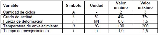 Teniendo en cuenta la descripción del tratamiento mecánico-térmico reiterado, dada en la sección anterior, se definen como variables de decisión del proceso, aquellos parámetros tecnológicos con una influencia significativa en la dureza obtenida. Las mismas se enumeran en la tabla 1, indicando sus respectivos valores mínimos y máximos los cuales fueron seleccionados por razones tecnológicas.