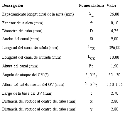 El modelo de intercambiador de calor compacto que se estudia, así como los generadores de vórtices en él dispuestos, quedan caracterizados por sus dimensiones o parámetros. En la tabla 1, se reflejan estos parámetros que se identifican en la figura 1.