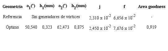 Para esta optimización se utilizó una población inicial igual a 200. Como función de selección se escogió la de tipo torneo. Se utilizó un régimen de mutación uniforme y cruzamiento del tipo disperso. Las iteraciones se detuvieron cuando fueron calculadas 10000 generaciones. Entre la población dominante de ese proceso de selección artificial, se escogió el modelo que más intensifica la transferencia de calor con las menores pérdidas de presión. Esta selección responde al criterio de mayor intensificación y mayor valor de la relación area goodness (ecuación 8). En la tabla 2 se presentan el modelo escogido y los resultados de j y f de la aleta de referencia.