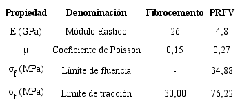 En [12, 13] se muestran las propiedades mecánicas del fibrocemento. En la tabla 1 se pueden observar estas propiedades al igual que las del material compuesto de PRFV obtenidas experimentalmente en esta investigación.