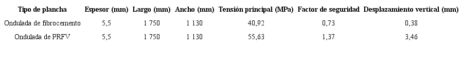 Las planchas de material compuesto a base de poliéster reforzado con fibra de vidrio al 15 %, presentan una mayor resistencia, con un coeficiente de seguridad mayor a uno y 1,88 veces superior respecto a la de fibrocemento.