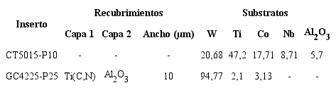 Se utilizó durante los ensayos experimentales, una herramienta de carburo recubierta (CVD) GC4225-P25, así como una Cermet sin recubrimiento CT5015-P10 para determinar las fuerzas de corte. Todas las herramientas fueron fabricadas por Sandvik y sus características se muestran en la Tabla 1 [18].