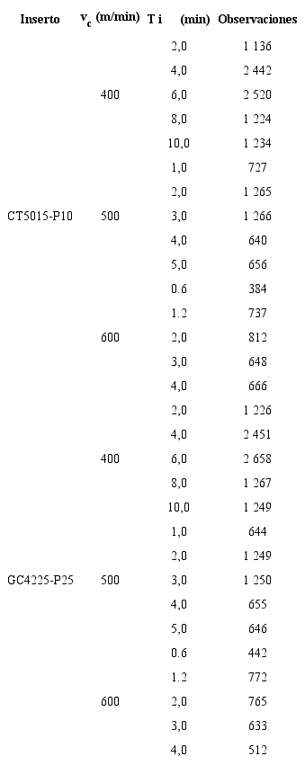 La investigación experimental se enfocó hacia la determinación de las fuerzas de corte de dos insertos (Cermet CT5015 sin recubrimiento y carburo GC4225 con recubrimiento) en el torneado en seco de alta velocidad del acero AISI 1045, variando la velocidad de corte y el tiempo de maquinado. La profundidad de corte y el avance se mantuvieron constantes durante todas las pruebas. El experimento se realizó utilizando dos niveles de material de herramienta de corte (CT5015-P10 y GC4225-P25), tres niveles de velocidad de corte y cinco niveles de duración de la prueba . Se realizó un diseño factorial completo con dos réplicas para la adquisición de información [18].