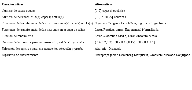 En correspondencia con la gran variedad de aplicaciones de las RNA, existen varias arquitecturas orientadas al modelado de fenómenos particulares que requieren estimación, clasificación, agrupación y predicción entre otras; en el caso que nos ocupa, se utiliza una red de tipo (PMC, Perceptrón Multicapas) debido a su potencial en el ajuste de funciones. La tabla 2 muestra la matriz del experimento computacional utilizado, a partir de la cual se obtuvieron los valores de las fuerzas de corte.