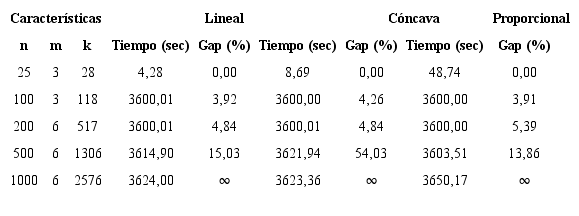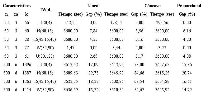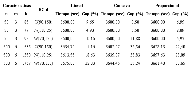 En la tabla 1, se establece el número de elementos n, el número de tipos de contenedor m y el número de contenedores k. Hay una columna para cada tipo de función de costo, lineal, cóncava y convexa, y dentro de cada una de ellas el tiempo utilizado por el solver y el gap. Como se puede evaluar, hay cuatro instancias donde se halló el óptimo global en poco tiempo, pero, a medida que crece el tamaño de la instancia, el gap (diferencia estimada respecto al óptimo) también aumenta, lo que significa que el solver no pudo encontrar una solución óptima en una hora. En este sentido, existe una diferencia entre la mejor solución posible y la encontrada.