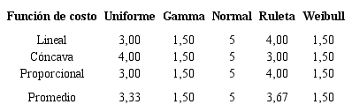 Conjunto 2: contiene variaciones en la distribución de los pesos de los elementos debido al uso de las distribuciones Uniforme, Gamma, Normal, Weibull y Ruleta. Los parámetros para cada distribución son: U [20,120], N (60,15), para Gamma Γ (20,4) y para Weibull, W (32,90) En el caso de la Ruleta, la probabilidad para los más pesados se estableció en 45 %, los medios en 15 % y los más pequeños tienen 40 %. La partición utilizada es exactamente la tercera parte del rango especificado.