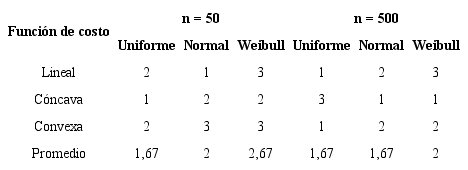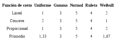 Como método de comprobación adicional, se realizó un promedio de rango (rank average) sobre el gap para cada distribución con cada función de costo. Las tablas 3 y 4 muestran que, efectivamente, la distribución normal con la media en el centro del rango de pesos de los ítems y una desviación estándar relativamente pequeña, aumenta la dificultad de las instancias. Como contraparte, Gamma y Weibull son las de menor complejidad. El estrecho rango de pesos de ítems para Weibull hace que el número de tipos de contenedores que el solver debe considerar sea mayor, es decir, dado que el ítem más pesado puede empacarse en el contenedor más pequeño, en general hay un mayor número de contenedores (considerando todos los tamaños) porque para cada tamaño de contenedor, debe haber suficientes contenedores para empacar todos los ítems. Sin embargo, el número de decisiones a tomar es menor ya que los pesos de los artículos se colocan en un rango muy pequeño y reduce el número de posibles opciones de contenedores. Esto permite pensar que a medida que el rango de pesos tiende a un solo valor, la complejidad disminuirá, siendo el mejor caso del problema.