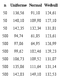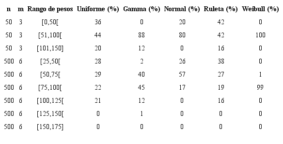 Hay otro hecho que debe destacarse. Las pequeñas instancias que siguen la Distribución Uniforme en los pesos, son similares en términos de espacio que la Ruleta, pero sucede algo diferente cuando el tamaño de las instancias crece. En la tabla 4, las instancias dentro de la Distribución Uniforme son las de menor complejidad, y contradice la suposición hecha en otros trabajos [3, 6, 12] de que esta distribución es la más difícil de resolver.