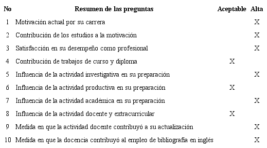Los criterios acerca del claustro de la carrera de ingeniería Mecánica en la Universidad de Oriente son muy favorables, caracterizándose por su preparación, su superación y exigencia, que contribuye a la formación integral de sus educandos. De la encuesta aplicada a los egresados, en la tabla 1, se puede apreciar que en siete de los diez aspectos, se alcanza un nivel de satisfacción elevado destacándose que la motivación actual por la carrera se mantiene elevada.
