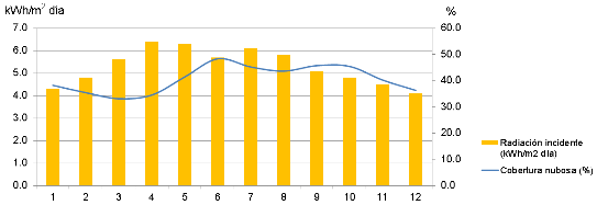 La radiación o irradiación solar promedio presente en la zona para cada mes, en kWh/m2 al día, se muestra en la figura 1, con un valor promedio anual de 5,0 kWh/m2 al día. [19]