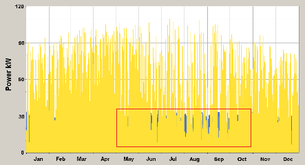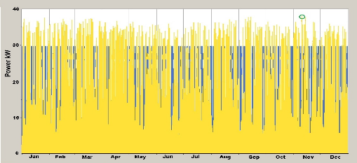 La energía obtenida de los módulos fotovoltaicos es de 160,0 kWh/día como promedio. No obstante, a pesar de ser 20,0 kWh mayor que los 140,0 kWh necesarios al día, hay días nublados en el año en los cuales no se llega a ese valor. Esto se evidencia en la figura 5, en la cual, en amarillo se representa la energía diaria generada por los módulos fotovoltaicos durante todo el año y en azul, la demanda de la flota. Puede apreciarse que los paneles nunca producen los 40,0 kW de potencia de diseño, el valor mayor alcanzado es de 38,0 kW en noviembre, señalado mediante el círculo verde. Existen en cambio varios días en el año en los que la potencia de los paneles no llega ni a los 30,0 kW de potencia máxima de recarga establecida. Finalmente resulta que a pesar de que el SFV entrega un exceso de energía anual, correspondiente a 23,6 MWh, no se cumple con la recarga y se tiene un déficit de 5,5 MWh al año.