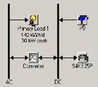 Para esta opción se probó adicionarle al sistema propuesto, de 133 paneles fotovoltaicos y 40,0 kWp, diez (10) baterías Surrette S4KS25P de 1900,0 Ah y 4,0 V de capacidad y voltaje nominal respectivamente. Con una corriente máxima de descarga de 67,5 A. El esquema de la instalación queda representado en la figura 8.