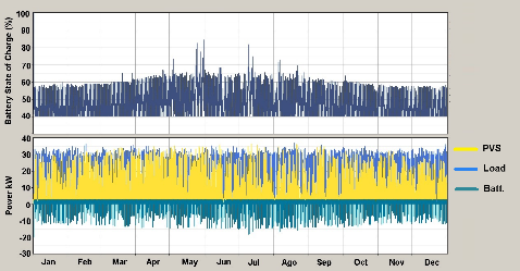 En la figura 9 se muestra el comportamiento anual del sistema. Se comprobó que las 10 baterías suministran el déficit de 5,5 MWh al año de energía del SFV y su descarga nunca sobrepasó el 45,0 %, figura 9.