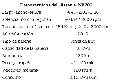 El vehículo que compone la flota es el panel modelo Nissan e-NV200, con capacidad para 7 personas, además del chofer, cuenta con una batería de 40,0 kWh de capacidad, sus características se pueden apreciar en la tabla 1: