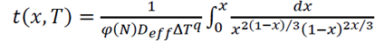 (2)Donde t es el tiempo que toma transformar una fracción x de austenita a la temperatura , es un coeficiente empírico, , G el tamaño de grano ASTM, D es el coeficiente de difusión efectiva, es el subenfriamiento y q es un exponente dependiente del mecanismo de difusión. Una vez obtenido el diagrama TTT, el diagrama CCT se obtiene empleando una regla aditiva bien establecida.
