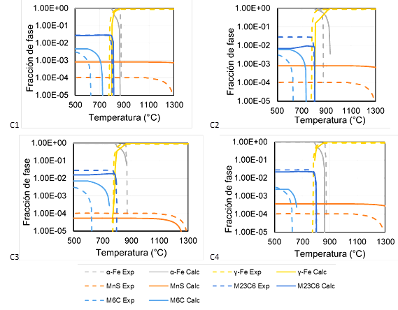 La presencia de ferrita a temperatura ambiente, la transformación de esta en austenita y los carburos presentes tienen un comportamiento coherente con los resultados experimentales de referencia (Dèpinoy et al [14]). El carburo se encontró que disolvía en el rango de temperatura intercrítica (excepto para C2) siendo C1 la composición que mejores aproximaciones brinda. En cambio, el estabiliza, para C1, C2, C3 y C4, a una temperatura de 722 ºC, 730 ºC, 750 ºC y 660 ºC. La diferencia observada se debe a la variación en las concentraciones de los elementos químicos compositivos de cada una de las composiciones estudiadas.
