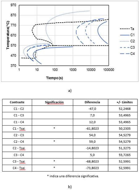La figura 2b indica que no existen diferencias significativas entre las medias de los valores de temperatura obtenidos para cada una de las composiciones estudiadas exceptuando los valores de C2 y C4 que si presentan tales diferencias. No obstante C2 es la única composición estudiada cuyas temperaturas no presentan diferencias significativas con respecto a Tsai et al [20].