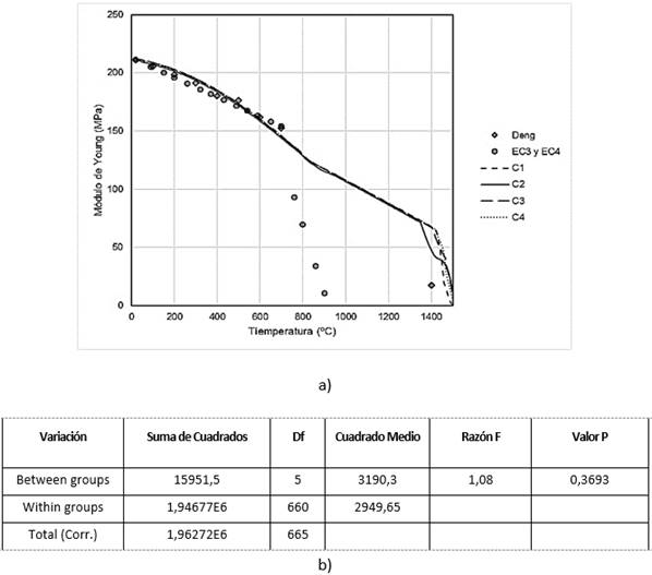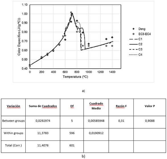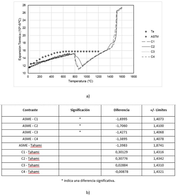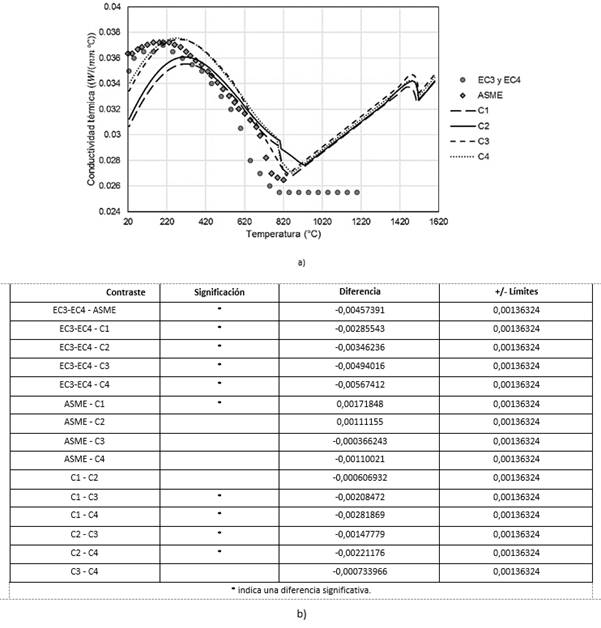 En la figura 4a se observan los valores obtenidos de la conductividad térmica para las cuatro composiciones. A temperaturas superiores a los 820 ºC se aprecian contrastes con los valores reportados tanto las normas europeas EC3-EC4 como por el código ASME, Sección II, Parte. Ello es debido a la diferencia entre las composiciones químicas y al tratamiento térmico de los aceros estudiados (incluyendo lo reportado por la referencia). Por otro lado, en la figura 4b se observan cuáles son los grupos que presentan diferencias significativas.