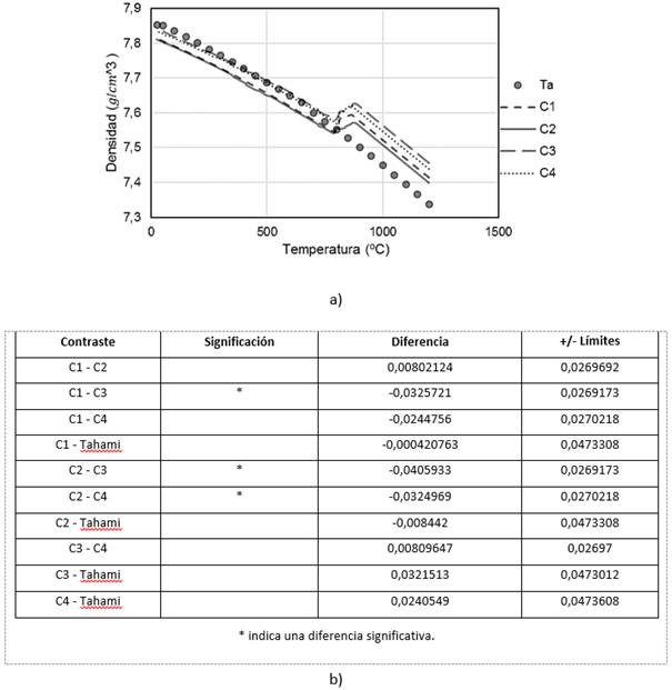 La figura 5a muestra el comportamiento obtenido de la densidad en función de la temperatura. Que tiende a disminuir con el aumento de la temperatura y hasta los 800 ºC mantienen un comportamiento semejante al planteado por Tahami et al [21]. Las diferencias a temperaturas superiores a los 800 ºC son consecuencia de la variabilidad de la composición química y del tratamiento térmico de austenización a que fueron sometidos los aceros. El salto observado coincide con el rango de temperaturas en el que ocurre la transformación ferrítico-austenítica que experimenta el material y con la presencia del carburo M23C6.