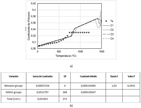 En la figura 8a se observa la relación que existe entre el coeficiente de Poisson y la temperatura. Nótese la tendencia al aumento de la propiedad en cuestión con el aumento de la temperatura encontrándose en correspondencia con lo planteado por Tahami et al [21].