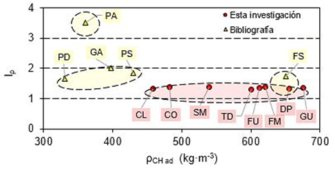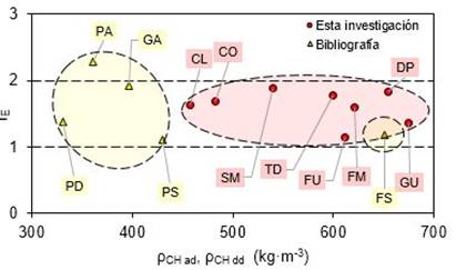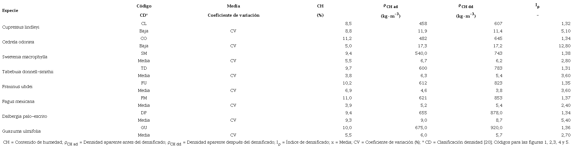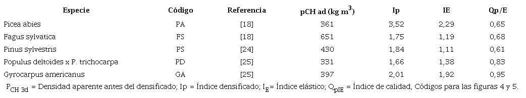 La tabla 2 resume los datos de la bibliografía, mientras que en la figura 1 se comparan con los datos de esta investigación. Los datos de la bibliografía provienen de configuraciones experimentales diversas, cuyas condiciones de tiempo, temperatura, presión y grados de densificado fueron particulares a cada una de las especies estudiadas. Sin embargo, el índice de densificado permite comparar directamente el potencial para el densificado de una especie, independientemente de las condiciones del tratamiento aplicado.